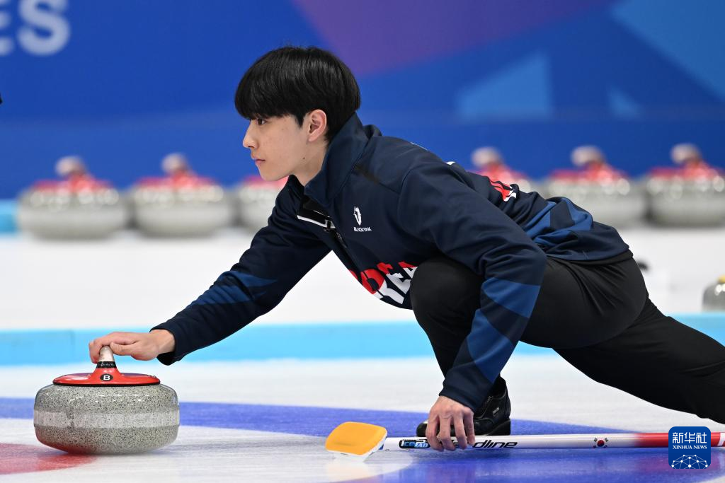 2月14日,韩国队选手李在秉在比赛中掷壶。