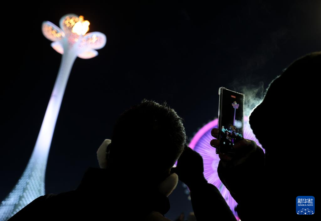 2月14日,观众在哈尔滨冰雪大世界拍摄亚冬会主火炬。