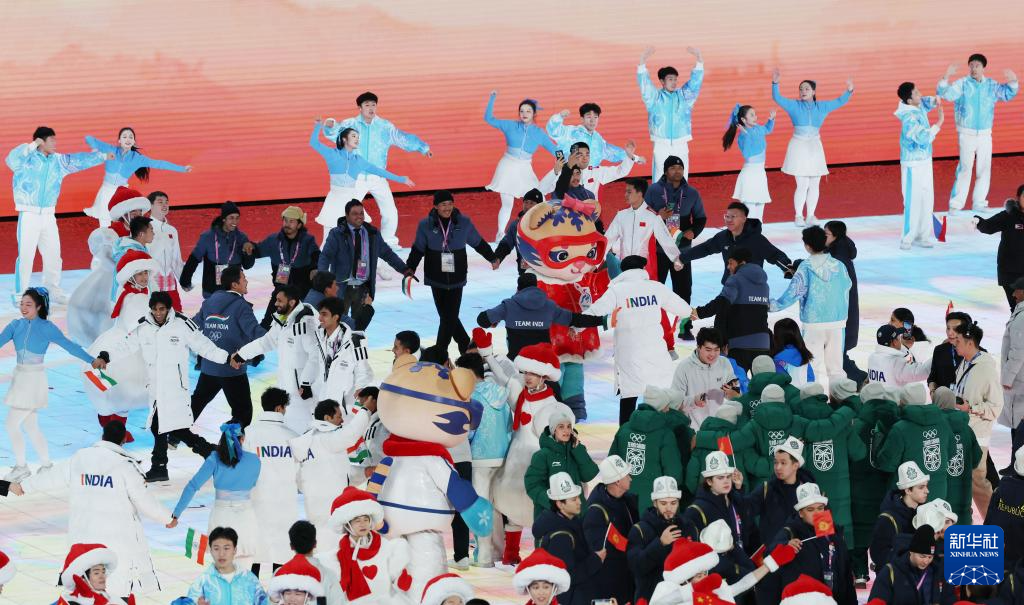 2月14日,运动员、演员、志愿者在闭幕式上一起欢庆。