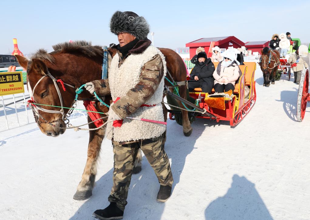 2月9日,马车拉着游客在哈尔滨松花江冰雪嘉年华上游览。新华社记者 侯俊 摄