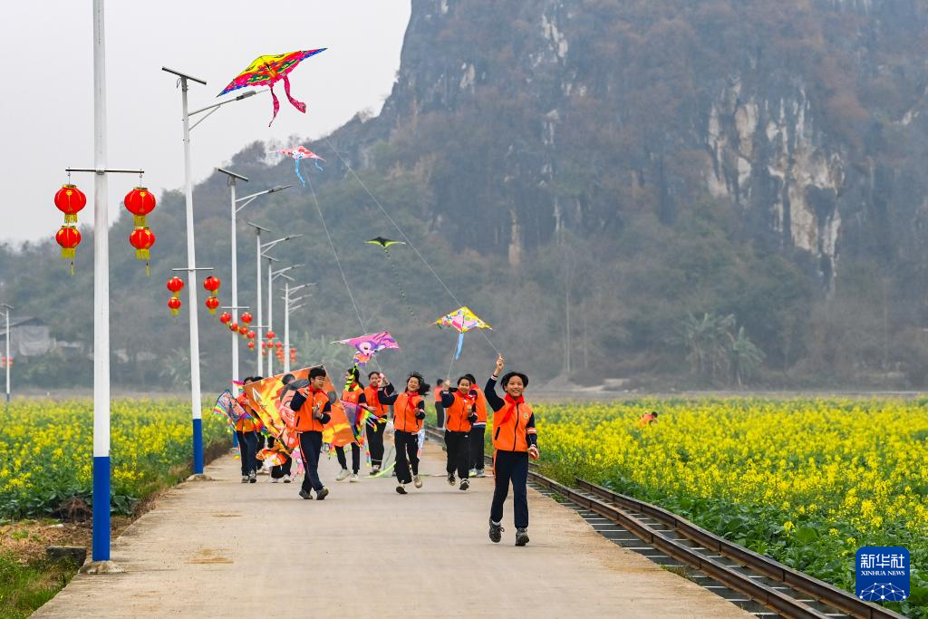 2月19日,在广西兴业县葵阳镇一处农田,学生们在机耕路上放风筝。新华社记者 曹祎铭 摄