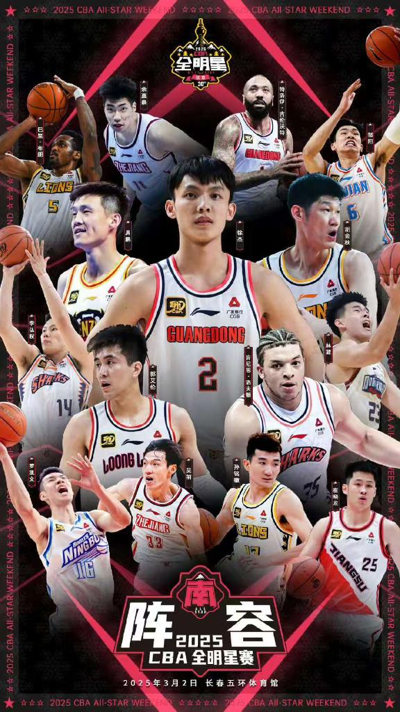 在最新公布的阵容名单中,南、北区明星队阵容备受关注。其中北区明星队首发阵容为周琦、曾凡博(北京)、杨瀚森(青岛)、赵睿(新疆)、赵继伟(辽宁)。替补球员包括张宁、哈米杜·迪亚洛(山西)、高诗岩(山东)、王睿泽(青岛)、韩德君(辽宁)、邹雨宸(北控)、姜伟泽、多米尼克·琼斯(吉林)、林庭谦(天津)、艾德蒙·萨姆纳(四川)。