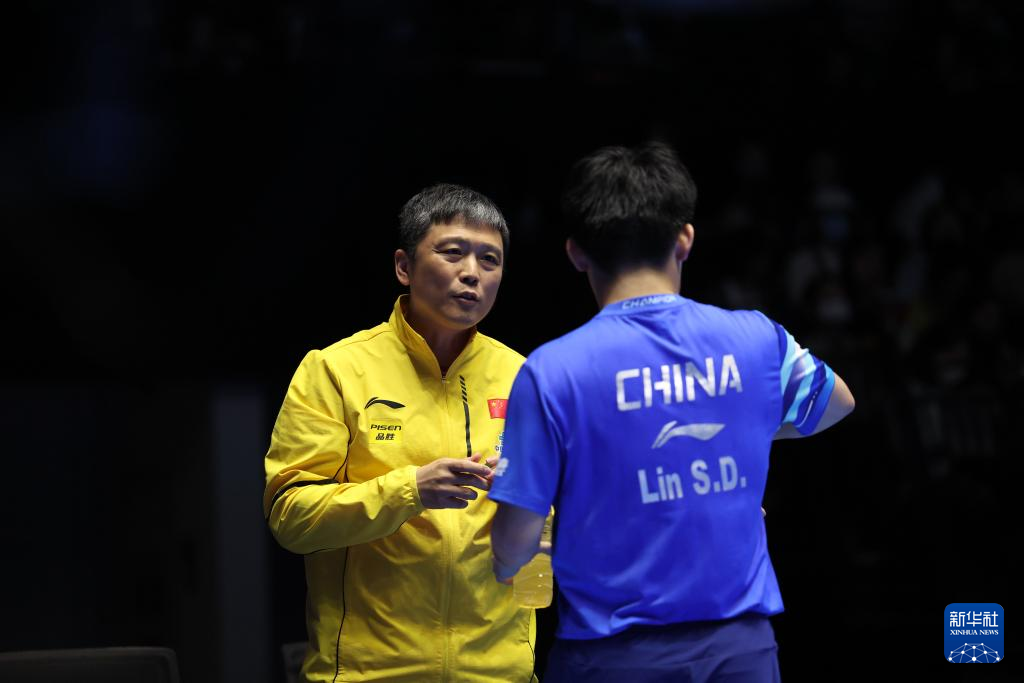2月21日,林诗栋(右)在比赛间隙与教练刘志强交流。