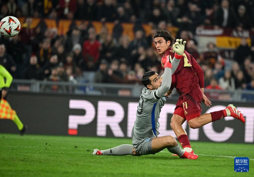 2月20日,罗马队球员迪巴拉(左一)在比赛中射门得分。