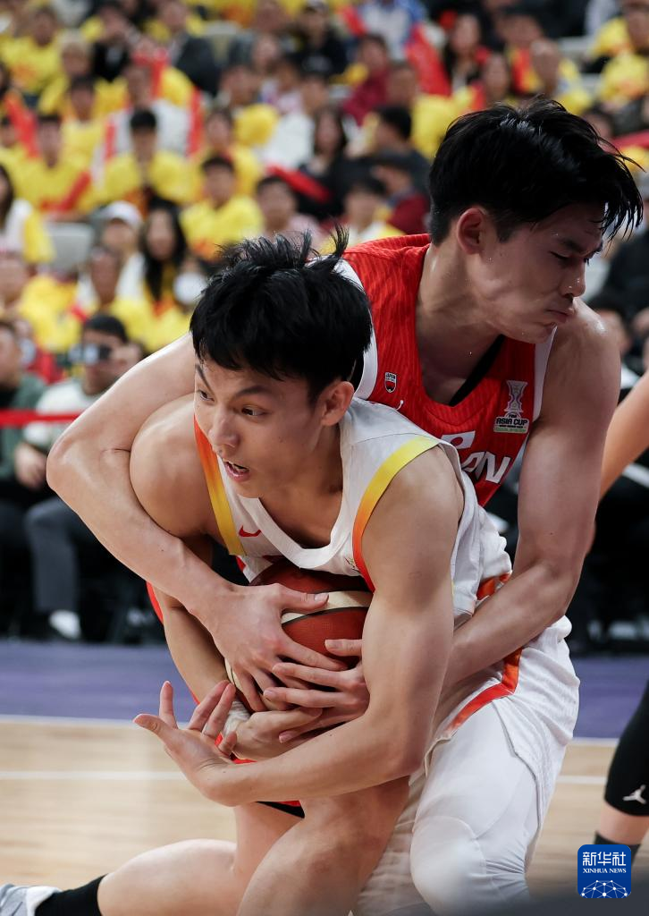 2月20日,中国队球员朱俊龙(右)和胡金秋(左)在比赛中争抢篮板球。