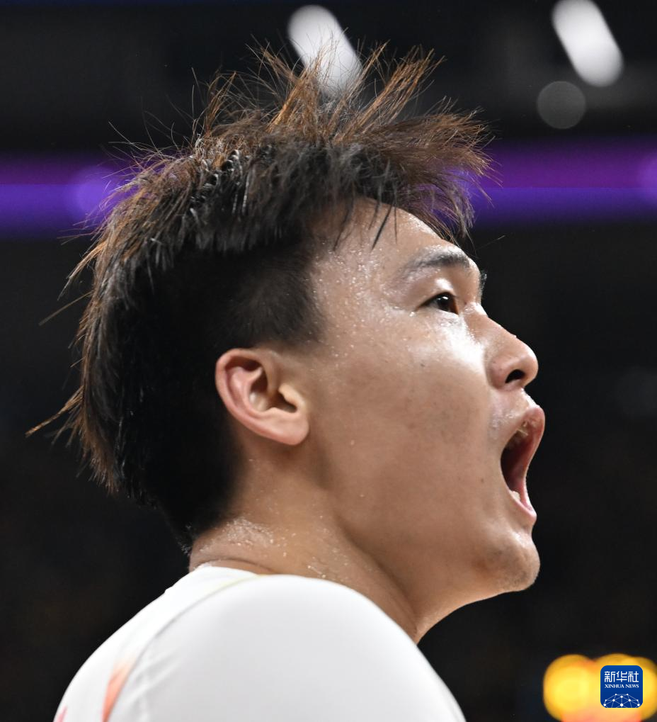 2月20日,中国队球员赵睿在比赛中庆祝得分。