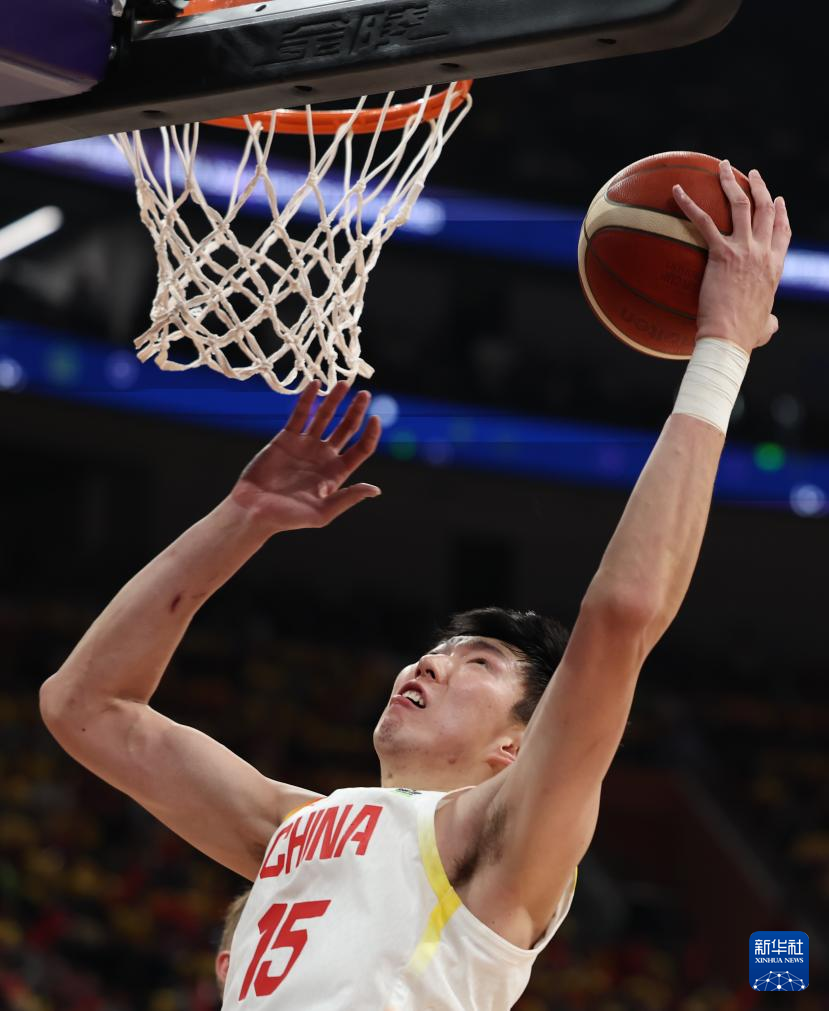 2月20日,中国队球员周琦(左)在比赛中上篮。