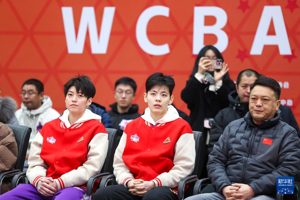 2月22日,来自合肥文旅队的WCBA全明星正赛球员王维琳(前左)与来自东莞新彤盛队的WCBA全明星正赛球员杨舒予(前中)在活动现场。