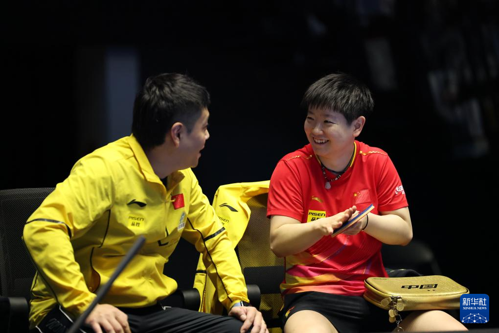 2月22日,孙颖莎(右)在获胜后与教练邱贻可交流。