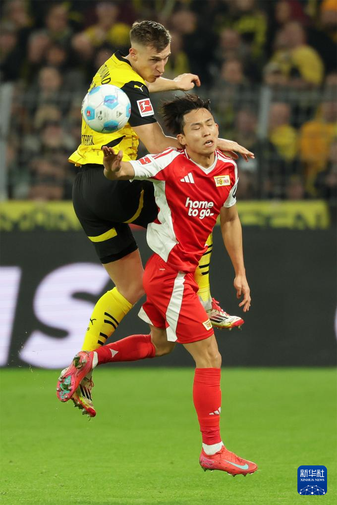 2月22日,多特蒙德队球员施洛特贝克(左)与柏林联合队球员郑优营在比赛中争抢头球。