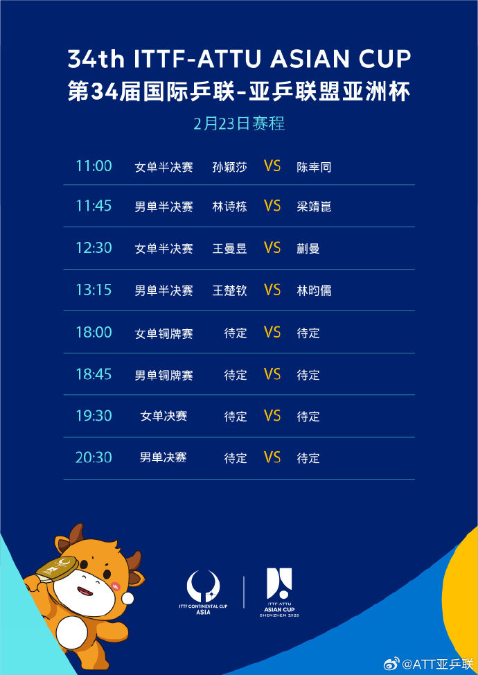第34届国际乒联-亚乒联盟亚洲杯22日产生男、女单打四强。中国队的孙颖莎、陈幸同、蒯曼、王曼昱包揽女单四强,男子四强则是国乒的王楚钦、林诗栋、梁靖崑以及中国台北选手林昀儒。