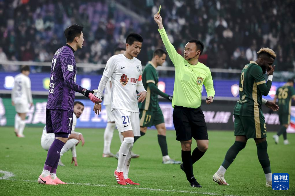 2月23日,主裁判王竞(右二)向大连英博海发队守门员隋维杰(左一)出示黄牌。