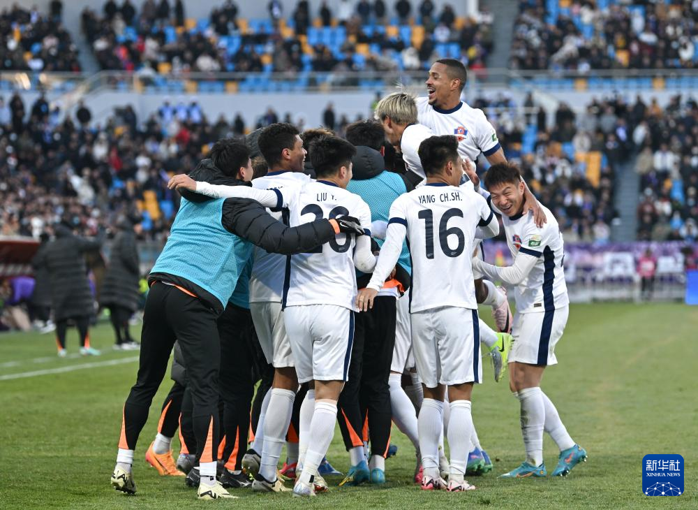 2月23日,天津津门虎队球员基莱斯(右一)庆祝为球队扳平比分。