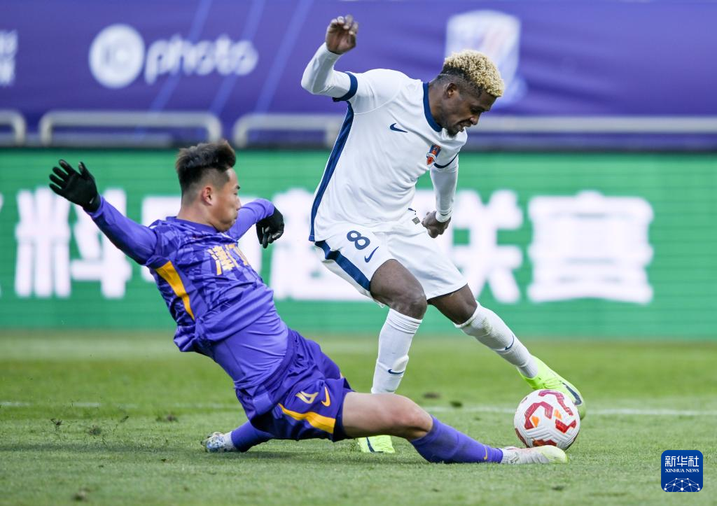 2月23日,天津津门虎队球员杨帆(左)防守梅州客家队球员恩戈姆。