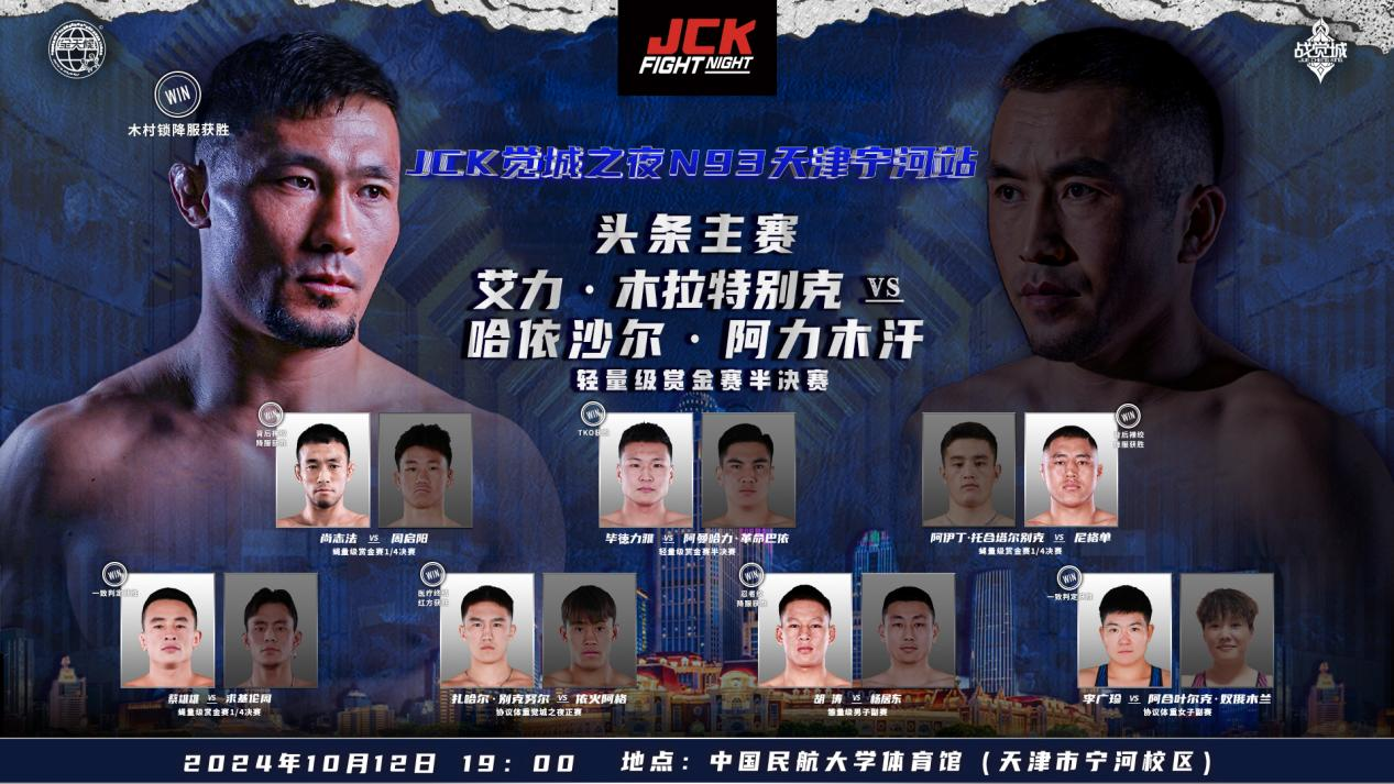 10月12日,JCK觉城之夜N93天津宁河站迎来了两个量级的赏金赛。轻量级赏金赛半决赛艾力·木拉特别克、毕徳力雅分别战胜对手,成功会师决赛;蝇量级赏金赛1/4决赛,郑伯切直接获得晋级资格,尚志法、尼格单、蔡雄雄晋级半决赛;正赛扎哈尔·别克努尔获胜;男子副赛胡涛忍者绞降服杨居东;女子副赛李广珍一致判定取胜。