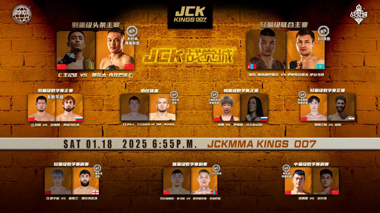 2025年1月18日,JCK战觉城王者系列007战罢,头条主赛那尔太·克孜巴依木村锁降服王纪征;联合主赛伊斯布拉耶夫·萨拉马特51秒KO图拉·那木楠巴雅尔;正赛部分吕凯与拉姆赞·阿赫马托夫战成平局,科申·阿卡诺夫一致判定战胜胡布兰·吐尔逊别克、梁娜小腿肌肉切降服伊琳娜·切尔尼绍娃、罗周江措背后裸绞降服哈刚;副赛部分鲁斯兰·博尔克瓦泽一致判定战胜常宇航、傲特根苏荣·苏赫巴图TKO努尔加那提·朱马依、钱腾园站立断头降服刘兴奇。