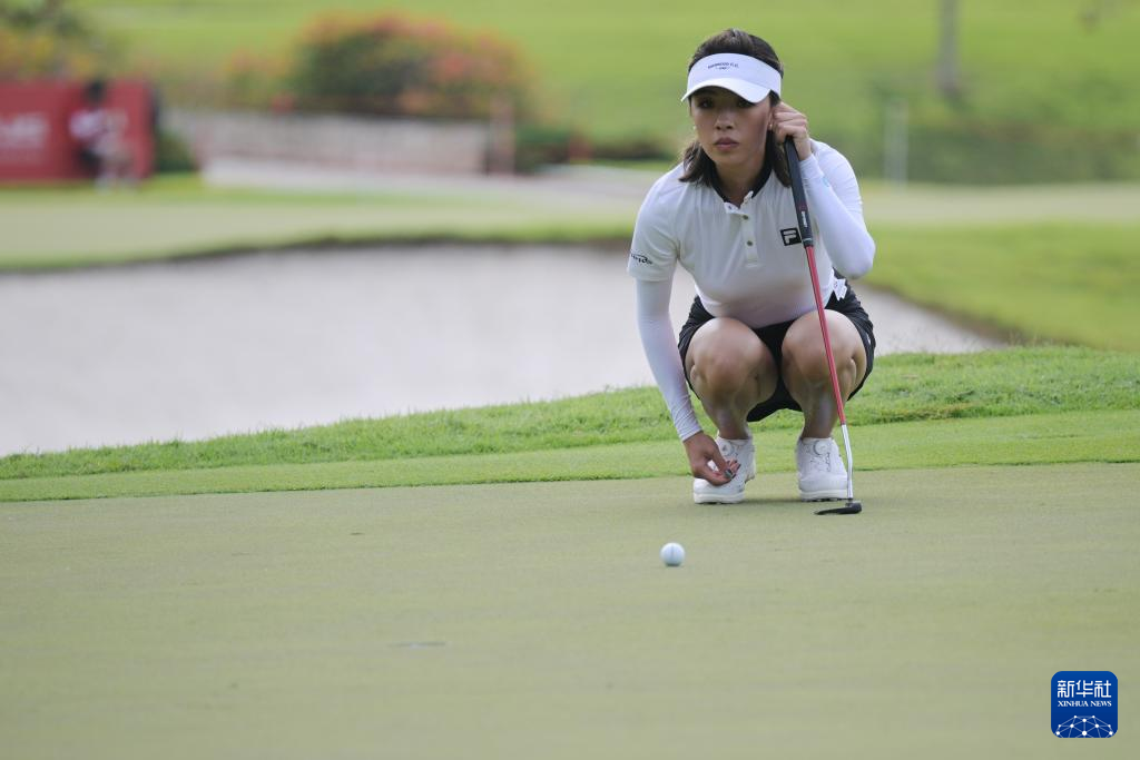 2月28日,中国选手何沐妮在比赛中观察球路。她在第二轮比赛中打出75杆,以两轮148杆、高于标准杆4杆的总成绩位列并列第45名。
