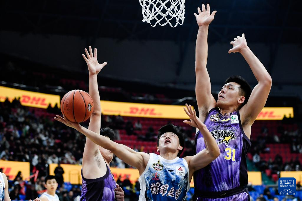3月1日,清华大学队球员卢骏(中)在比赛中上篮。