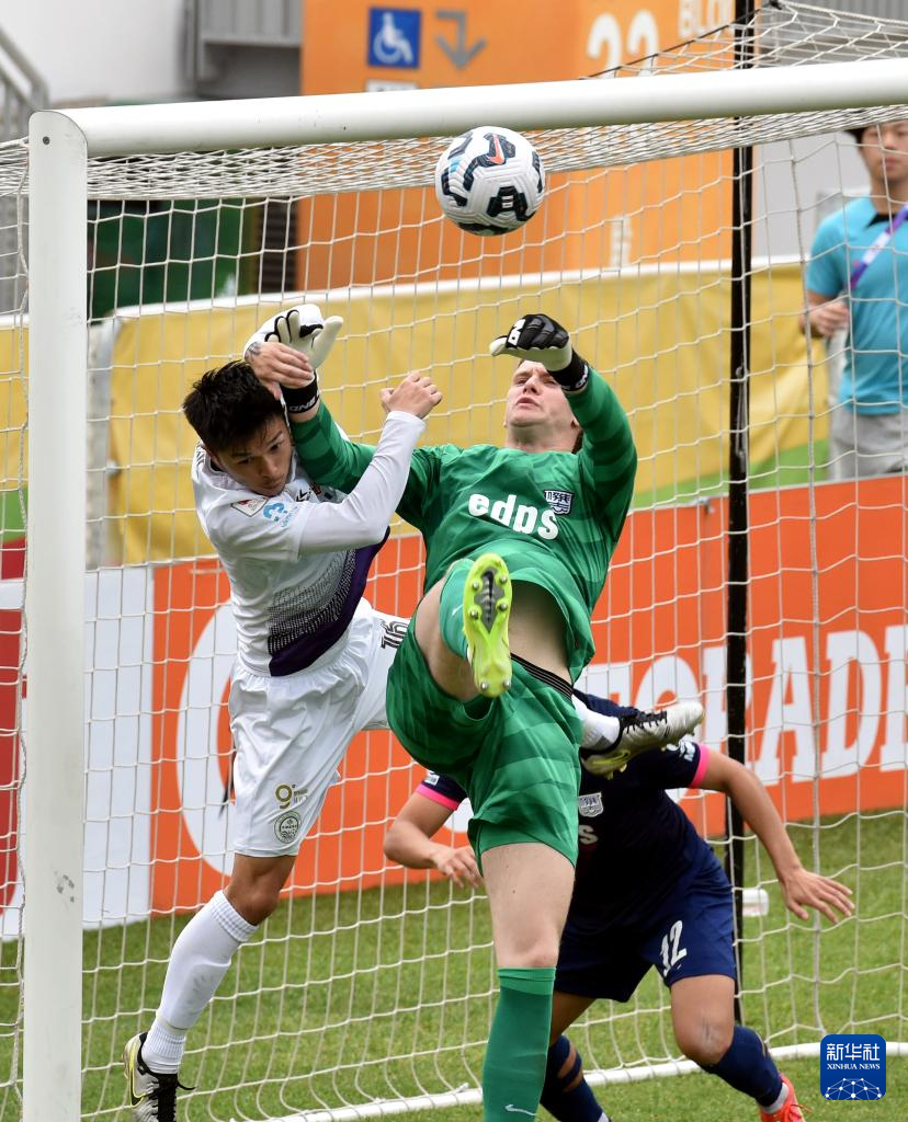 3月1日,大埔队球员陈肇钧(左)与杰志队守门员泰利在比赛中拼抢。