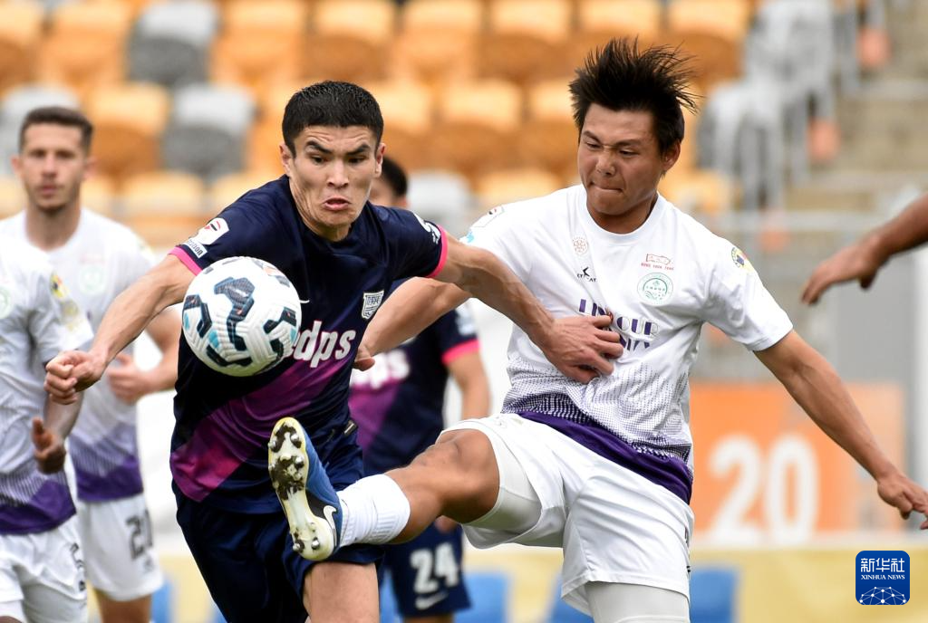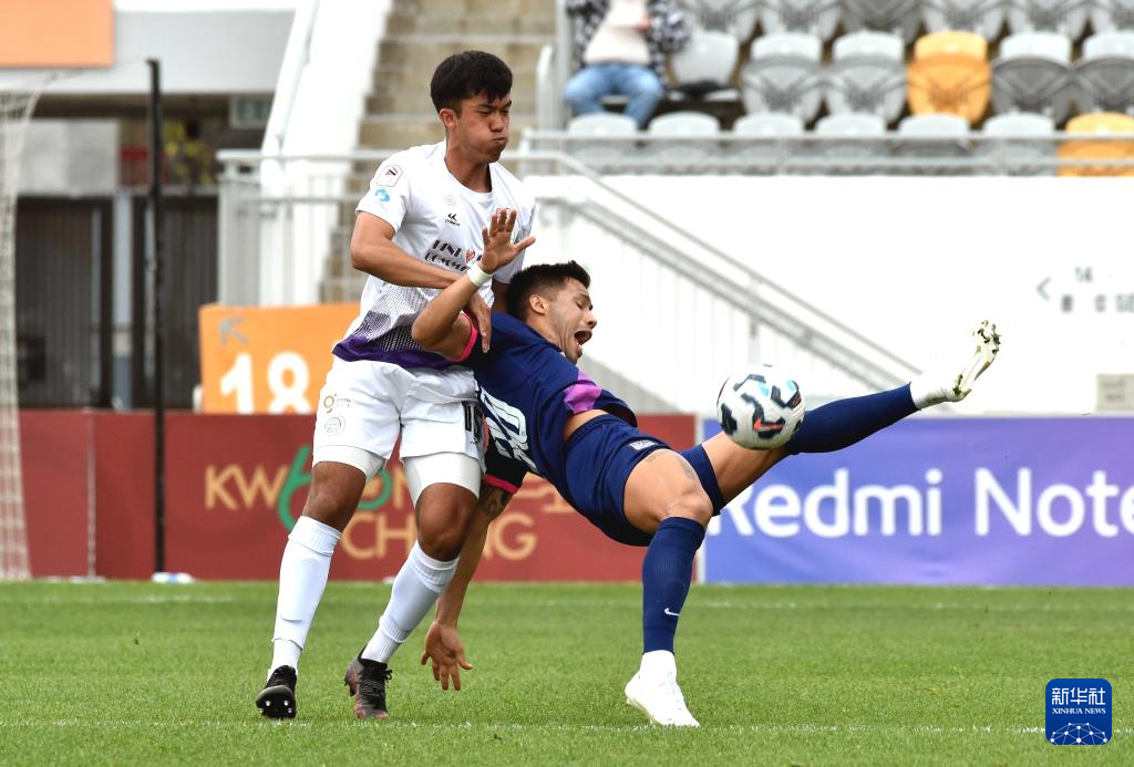 3月1日,大埔队球员冯冠鸣(右)与杰志队球员迪美路夫在比赛中拼抢。