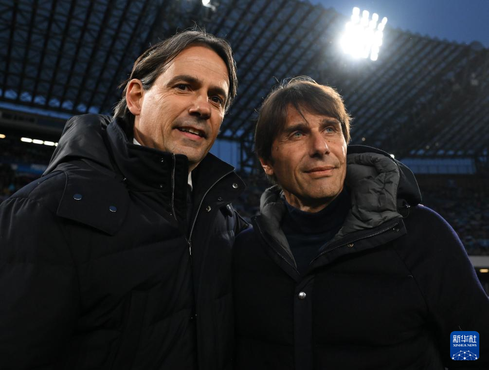 3月1日,国际米兰队主教练因扎吉(左)与那不勒斯队主教练孔蒂在比赛前致意。