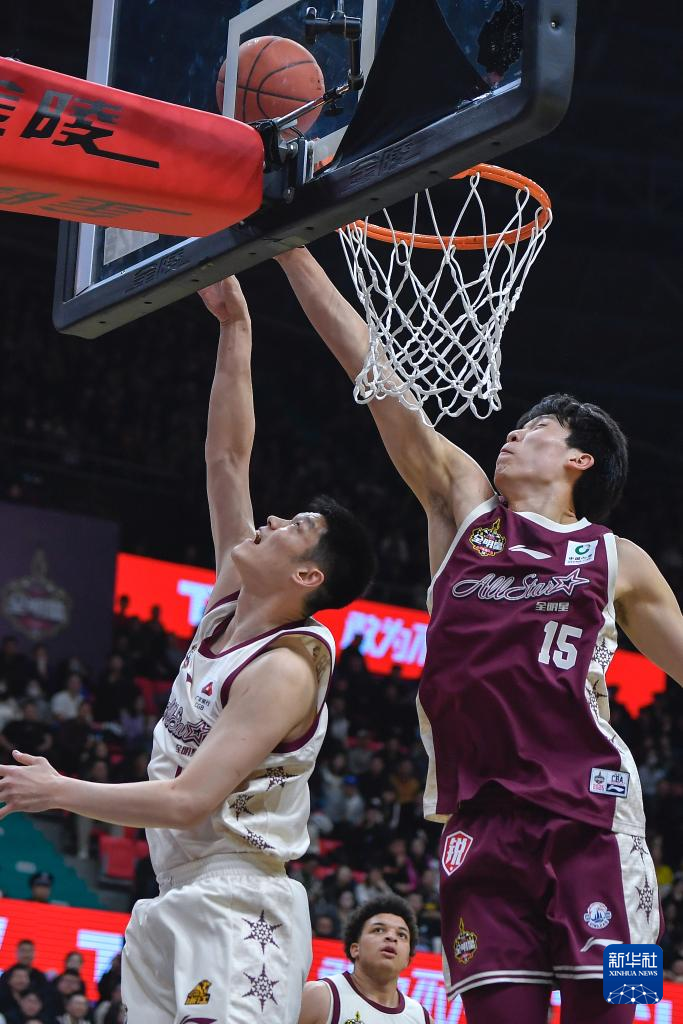 3月2日,南区明星队球员余嘉豪(右一)在比赛中托举北区明星队球员高诗岩(上)帮助其扣篮。