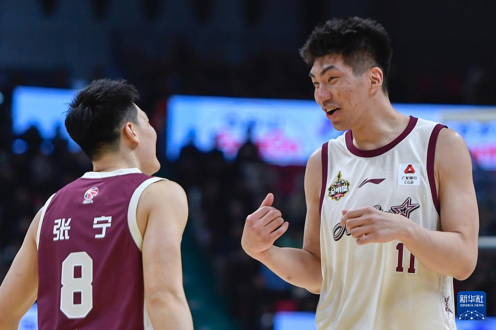 3月2日,南区明星队球员余嘉豪(右)在比赛中与北区明星队球员张宁交流。