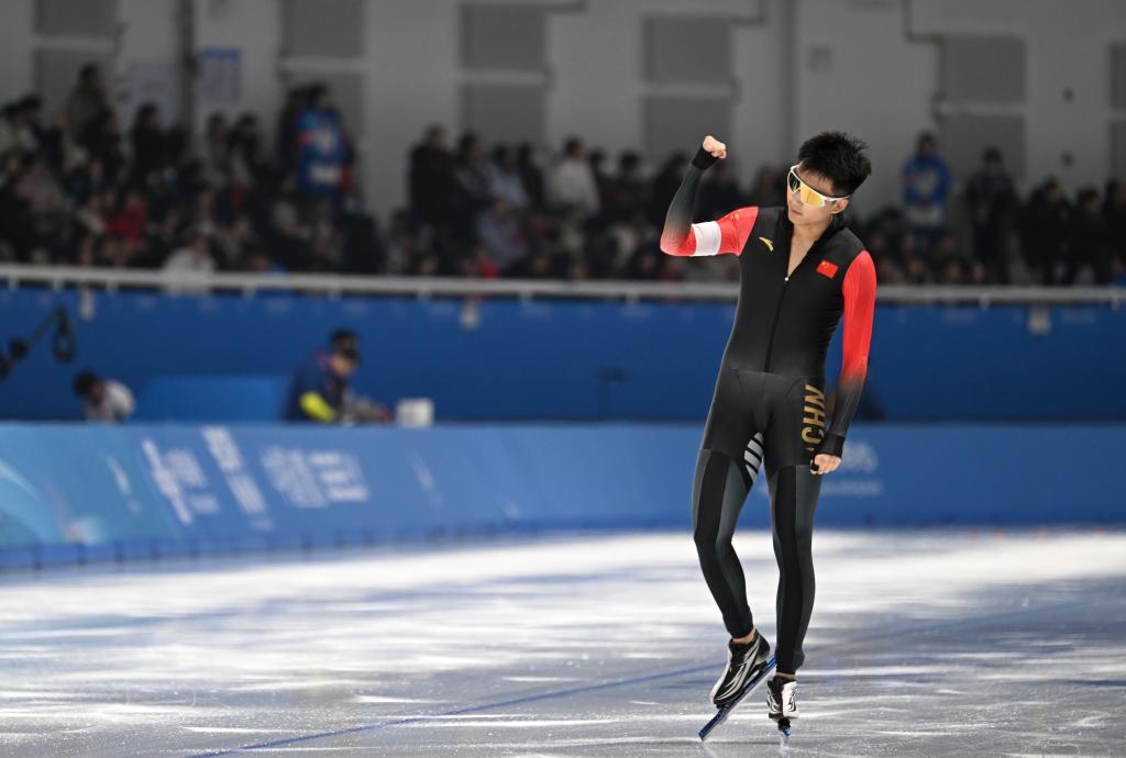2月10日,高亭宇赛后庆祝。当日,在哈尔滨举行的第九届亚冬会速度滑冰男子500米比赛中,中国选手高亭宇夺得冠军。新华社记者 王曦 摄