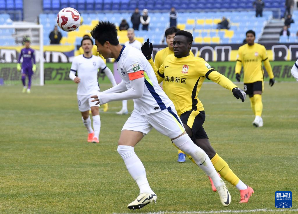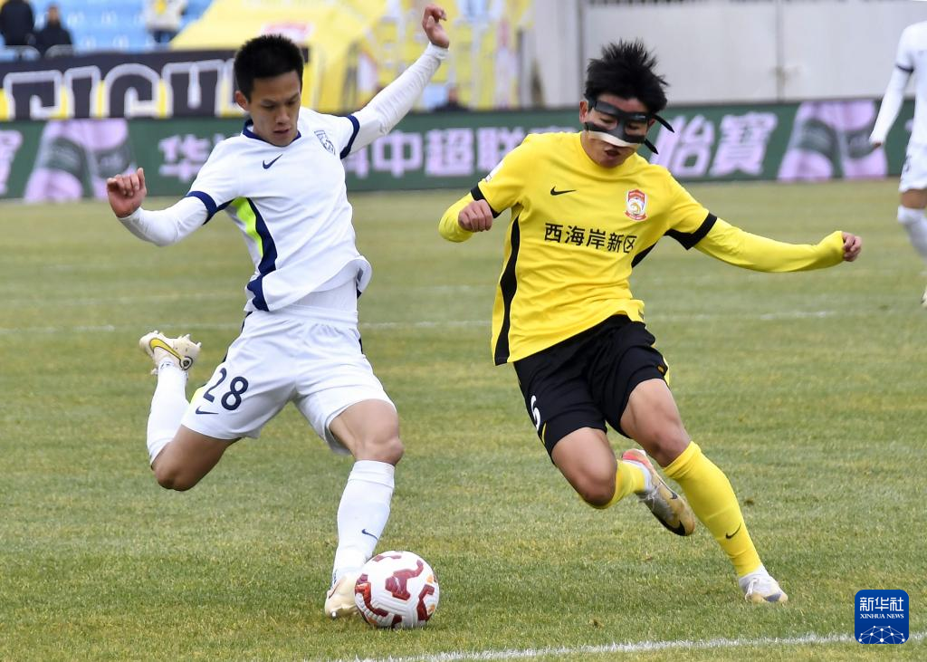 3月3日,青岛西海岸队球员徐彬(右)和武汉三镇队球员王毅在比赛中拼抢。