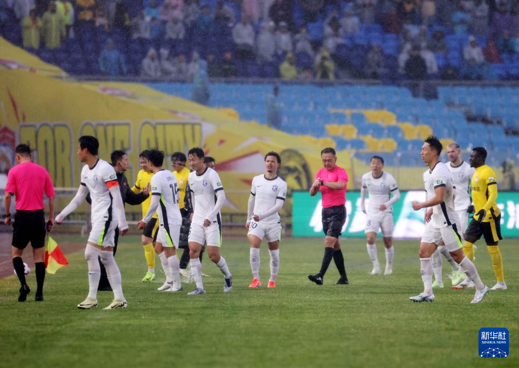 3月2日,主裁判刘威(右五)宣布比赛因大雨暂停。