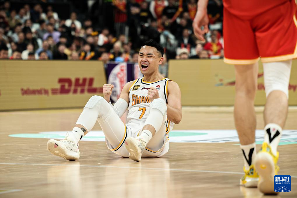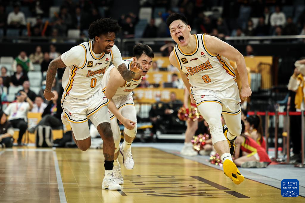 3月5日,山西汾酒队球员张宁(右)命中绝杀球后庆祝。