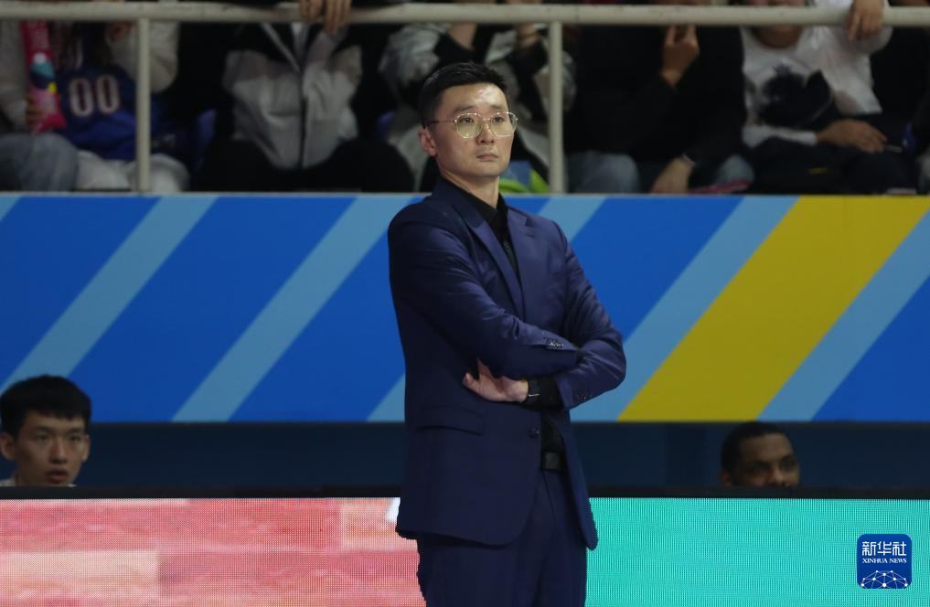 3月5日,新疆伊力特队主教练刘炜在场边观看比赛。