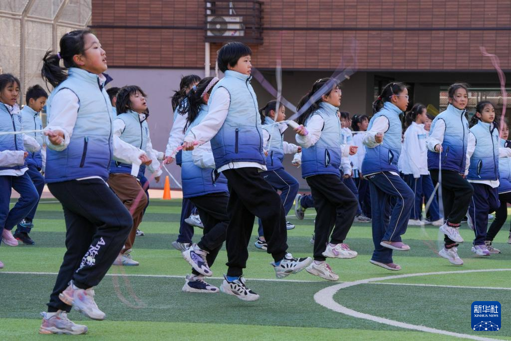 在北京市宣武师范学校附属第一小学,学生在体育课上跳绳(2月21日摄)。