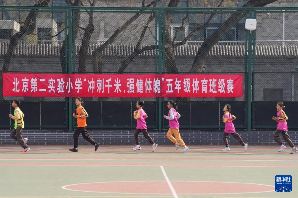 在北京第二实验小学,学生在体育课上进行1000米跑“班级赛”(3月5日摄)。