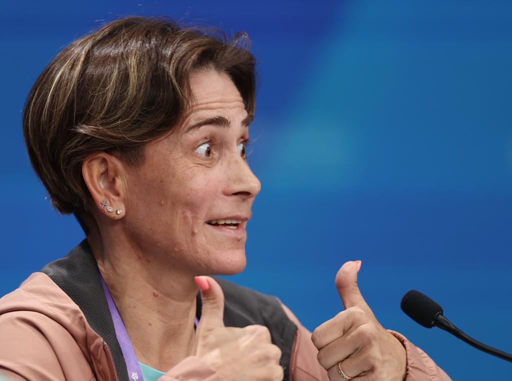 ↑2023年9月29日,丘索维金娜在杭州亚运会主媒体中心举办的新闻发布会上回答记者提问。新华社记者 贾浩成 摄