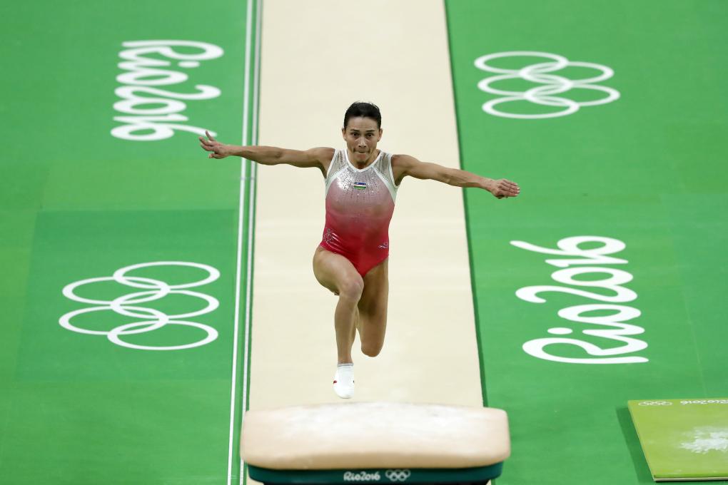 ↑2016年8月7日,41岁的丘索维金娜在里约奥运会女子体操预赛中。新华社记者 沈伯韩 摄