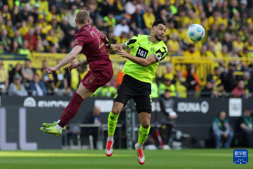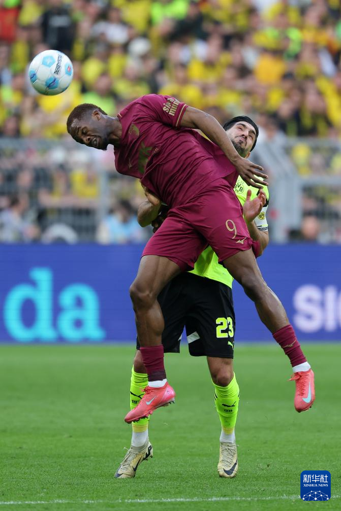 3月8日,多特蒙德队球员本塞拜尼(右)与奥格斯堡队球员延森在比赛中争顶头球。