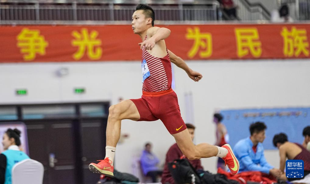 3月8日,上海队选手粟文在男子三级跳远决赛中试跳。他以17米07的成绩获得第一名。