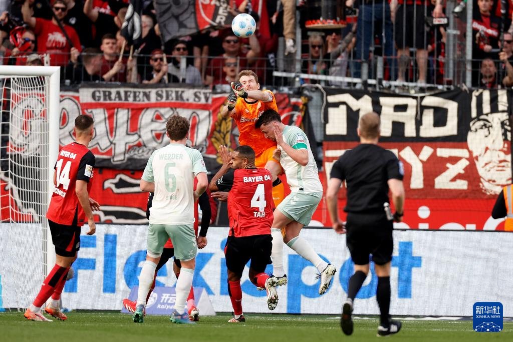 3月8日,勒沃库森队守门员赫拉德茨基(中)扑出云达不来梅队的射门。