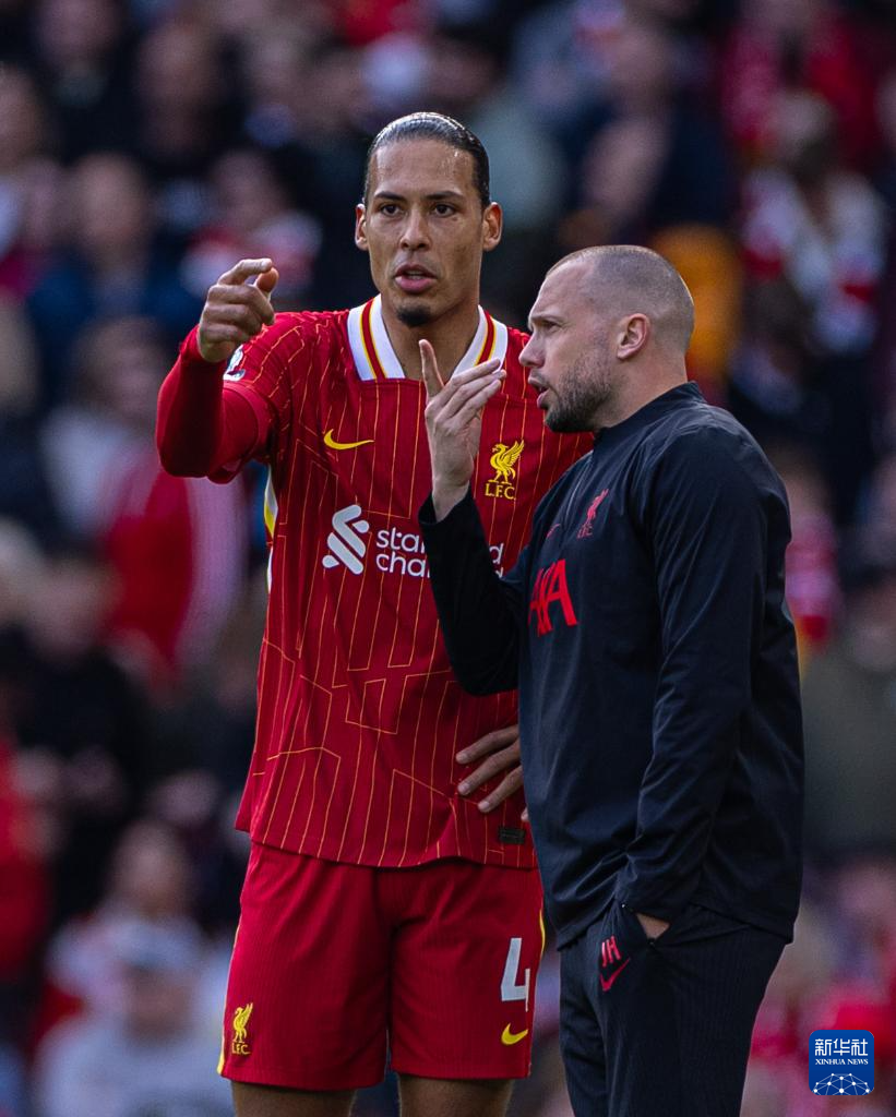 3月8日,利物浦队球员范戴克(左)在场边与助理教练海廷加交流。