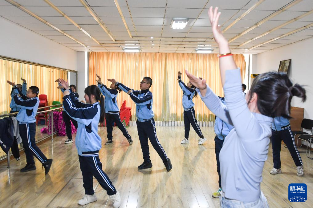 3月12日,四平市聋哑学校学生跟随老师练习健美操。