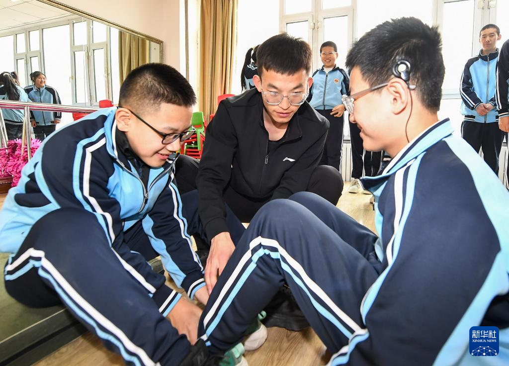 3月12日,四平市聋哑学校体育老师刘金鹏(左一)帮助学生练习课间操。