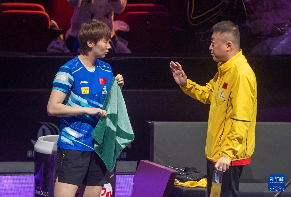 3月12日,教练马琳(左)在比赛间隙指导王曼昱。