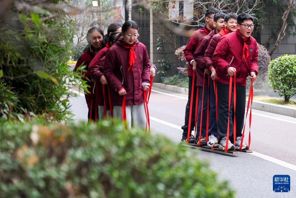 3月11日,杭州市钱塘区文思小学学生在课间玩板鞋游戏。