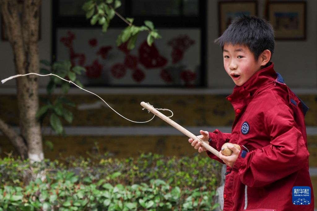3月11日,杭州市钱塘区文思小学学生在课间玩陀螺。