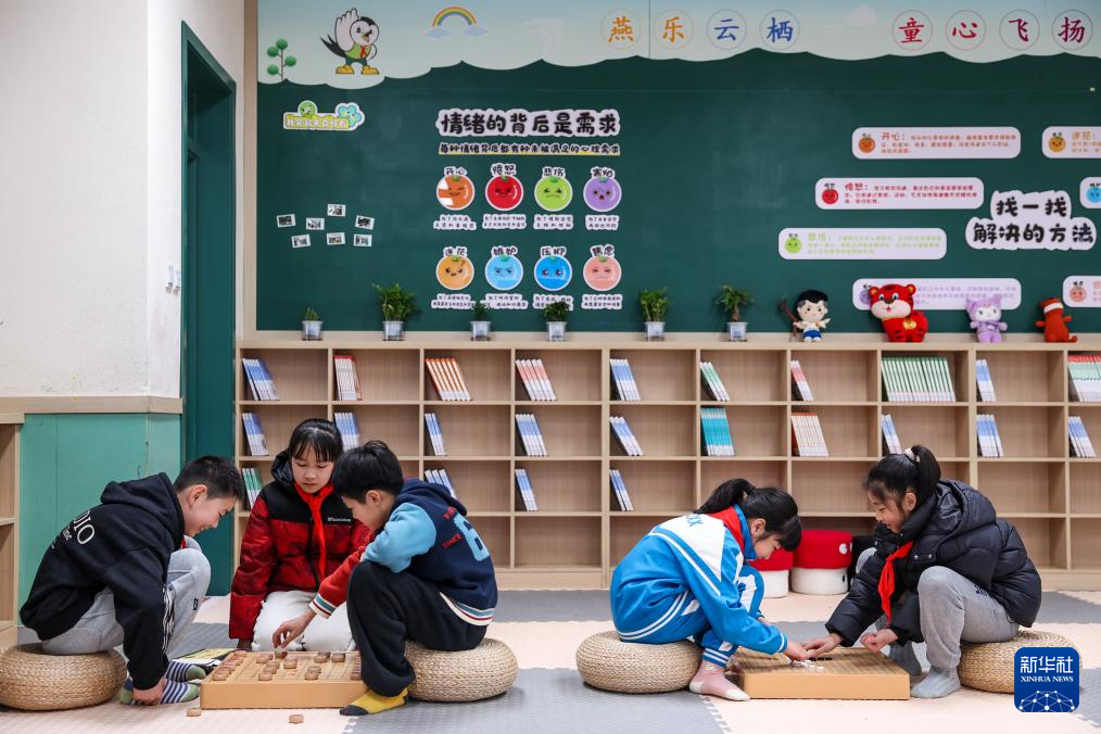 3月12日,杭州市学军小学教育集团云栖小学学生课间在空闲教室改造的活动室下棋。