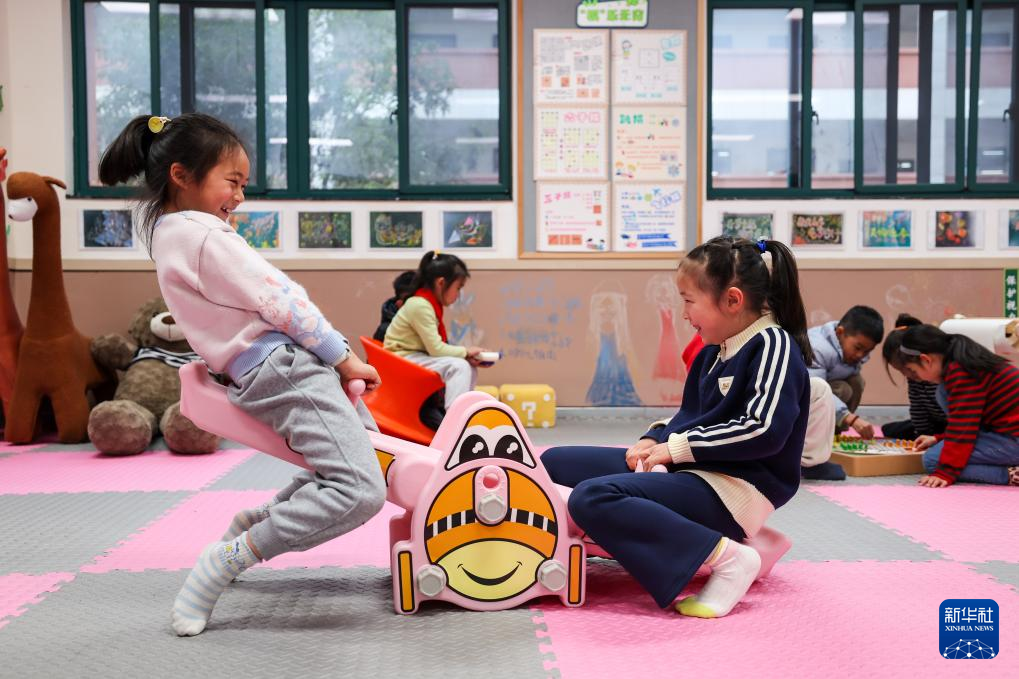 3月12日,杭州市学军小学教育集团云栖小学学生课间在空闲教室改造的活动室玩耍。