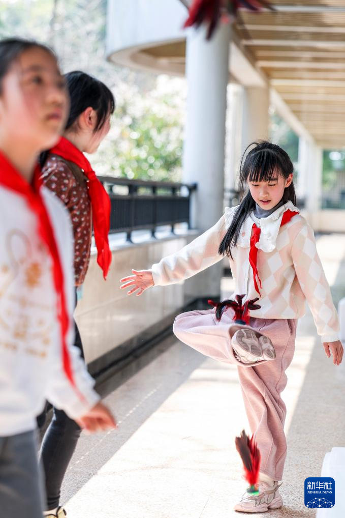 3月11日,杭州市京都小学学生课间在走廊上踢毽子。