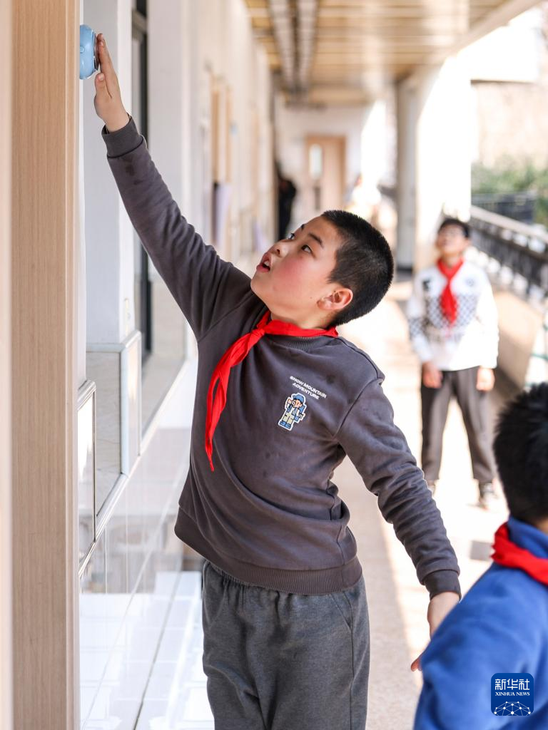 3月11日,杭州市京都小学学生课间利用走廊的运动设施摸高。