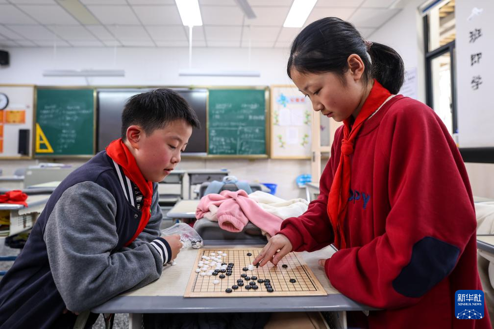 3月11日,杭州市京都小学学生在课间下棋。